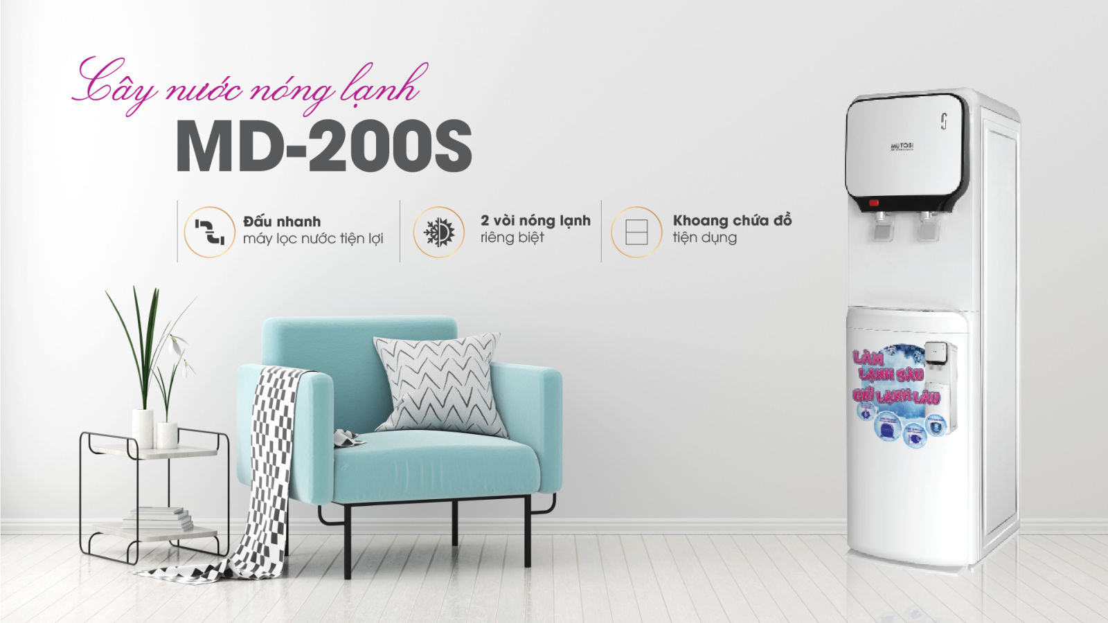 Điểm đặc biệt ở cây nước nóng lạnh MD-200S là có đầu chờ tích hợp đấu nối với máy lọc nước có sẵn, nên có thể thoải mái sử dụng nước 24/24 mà không lo bị hết nước. Sản phẩm được rất nhiều gia đình, văn phòng tin dùng vì tính tiện lợi và thiết kế thông minh. Trên thực tế, việc sử dụng các sản phẩm bình nước gallon khiến cho các gia đình cũng như văn phòng tốn rất nhiều thời gian, công sức để thay thế bình nước hàng ngày.