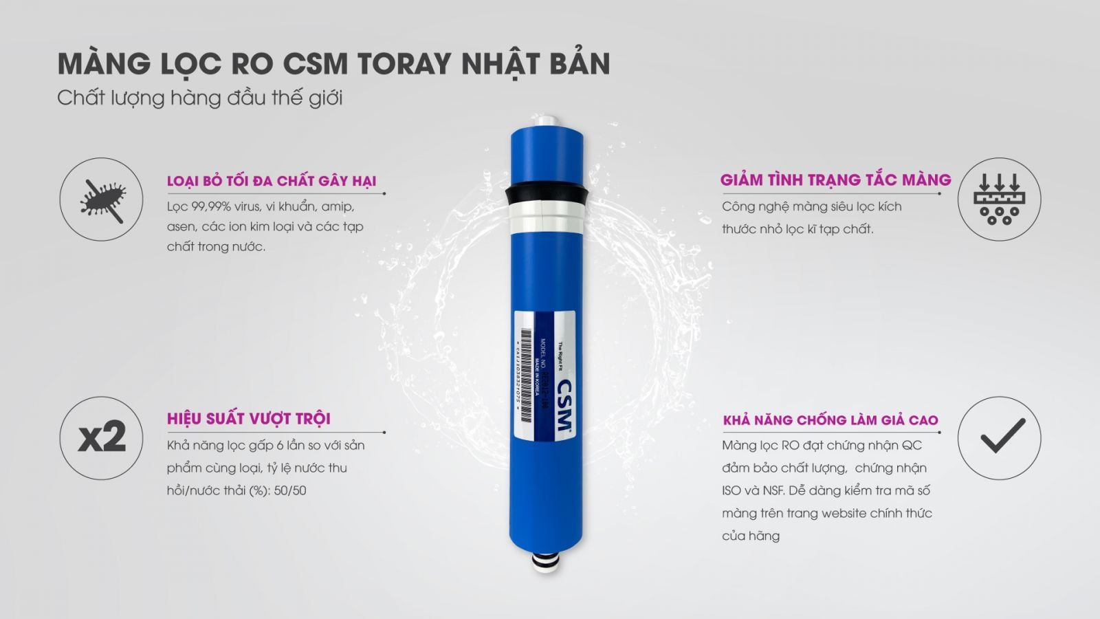 | Màng lọc | CSM Toray Nhật Bản 100 GPD |